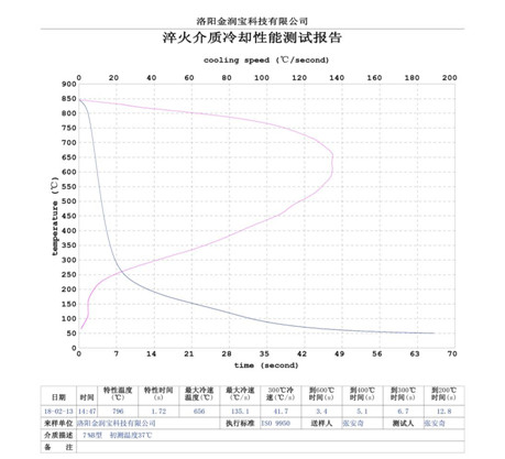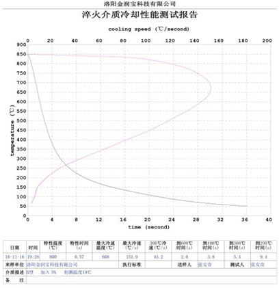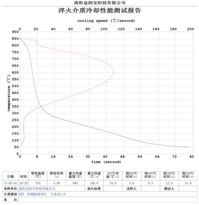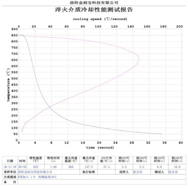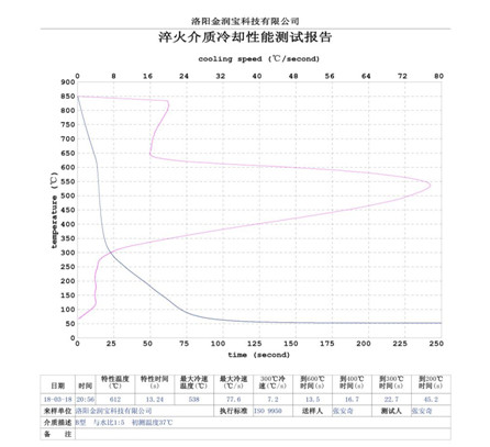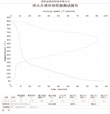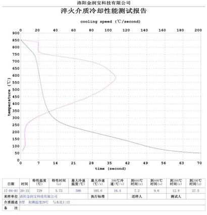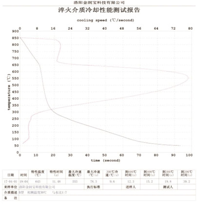 本產品無色或淡黃色透明液體,PH值為7。原液與水配比1:4~1:20之間。當原液與水配比為1:4~1:9之間時,可完替代慢速淬火油、中速淬火油和高速淬火油。原液與水配比為1:4~1:5時,與慢速淬火油的冷卻性接近;原液與水配比為1:6時的水溶液的冷卻性與光亮中速淬火油的性接近;原液與水配比為1:8——1:9時的冷卻性與高速淬火油的性接近。