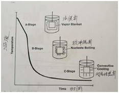A期冷卻區域,在熱金屬表面形成了層蒸汽膜。繼續冷卻過程,從A期到B期出現個過渡階段。B 期冷卻是經過核沸騰完成的,這是淬火過程中冷卻快的區域。當探頭溫度低于淬火介質沸點時,C 期冷卻開始,在該點沸騰停止,探頭的冷卻主要靠介質的傳導與對流而減慢,這時稱為對流傳熱期。